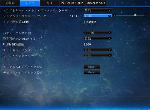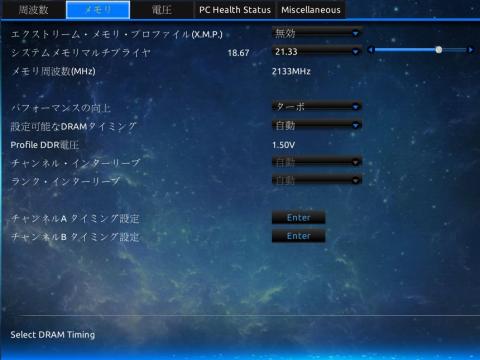 2000MHzは軽すぎでしたかね。ということで次は2133MHzです。上位版のCMY8GX3M2B2133C9の定格電圧が1.65Vであることを考慮して、電圧も1.65Vにあげておきます。タイミングも違いますが、それは失敗した時に再設定することにします。