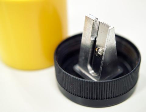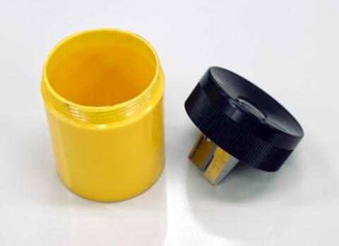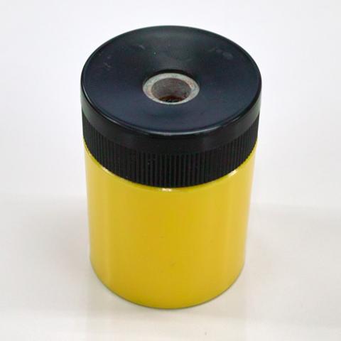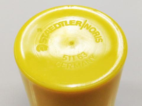 派手なカラーリングの樹脂製容器に黒いフタ、パッと見はポスターカラーのボトルのような感じですが、今見ても飽きのこないシンプルなデザインが秀逸です。フタの内側にはアルミ製の鉛筆削り(刃は鋼)が付属しており、さすがはステッドラー製といったところです。