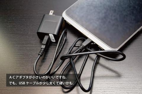 付属のUSBケーブルが少し太くて硬いのが難点ですが、ACアダプタが小さいので持ち運びし易すいのは好印象です。