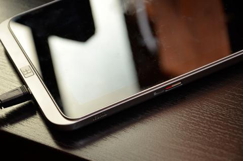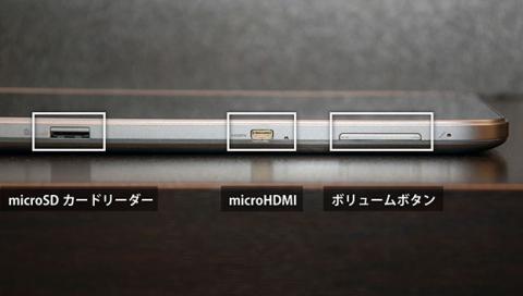 右側面にはmicroSDリーダーにmicroHDMI出力、そして音量のボリュームボタンがあります。ちなみにmicroHDMIの出力できる解像度は、公式サイトには書かれていませんが最大1,920×1,080ドットまでサポートされています。