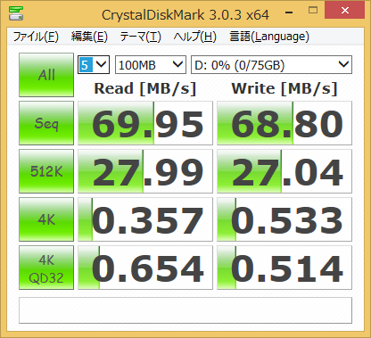 普通に速度出ています。メインマシンでUSB3.0経由で接続したときよりもSeqでは速度出ています。