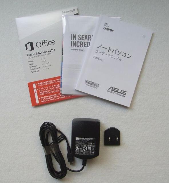 付属品は、 マニュアル、保証書、USB ACアダプタ、Office Home and Business 2013のプロダクトキーカード。5万円程度の端末でありながらOffice付き。コストパフォーマンスは非常に高い。