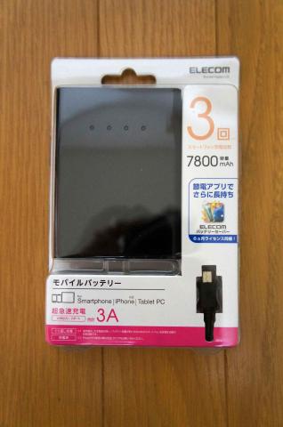 エレコムのモバイルバッテリー。容量は7800mAh。入力はMicroUSB。出力はUSBで2ポートあります。2ポート合計で3Aの出力。