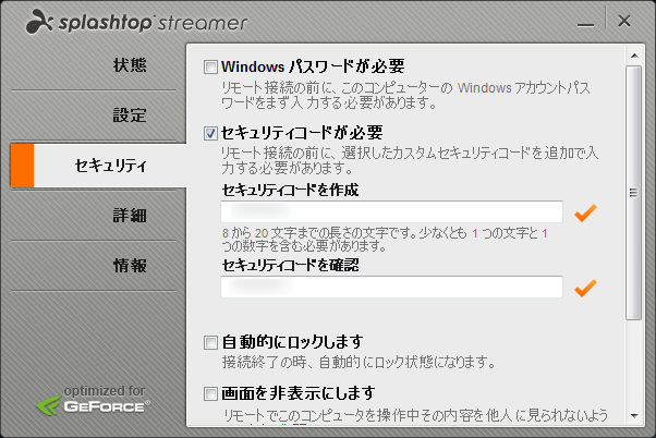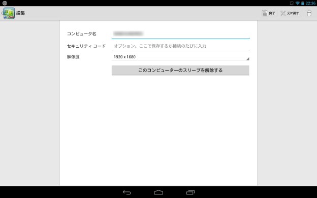 解像度を設定とPCで作成したセキュリティコードを保存する。セキュリティコードは保存せずに接続毎に入力しても良い。