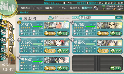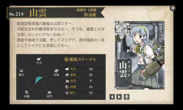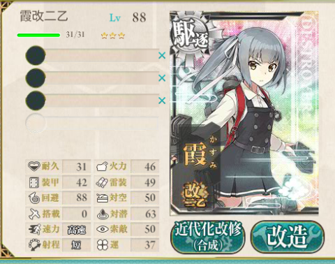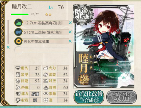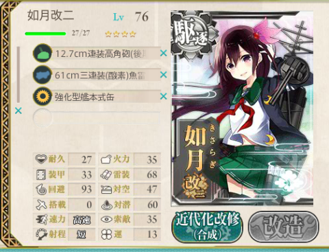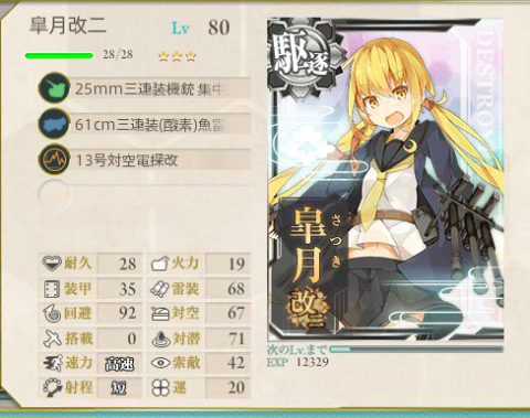 皐月改二が実装されたので、改造しました。燃費はそのままで能力が大幅に上がりました。また大発動艇を装備できるようになりました。遠征用に霞改二を量産した方がいいかなと考えていましたが、ヴェールヌイもアップデートで大発動艇を装備できるようになったし、今後も装備できる駆逐艦が増えそうなので、燃費の問題はありますが、遠征用に同じ駆逐艦を量産する必要はなさそうです。