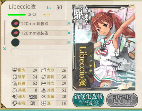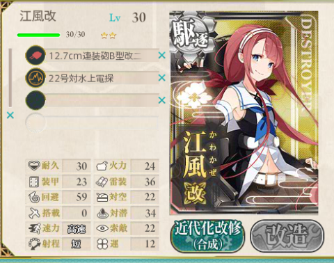 改二より火力と雷装の上限が下がりましたが、大型電探を使えるようになるのでFuMO25 レーダーを装備させるとかなり強そう。