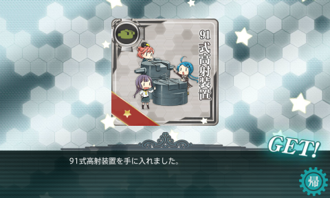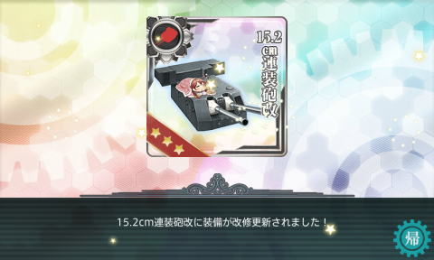 2つ目は2014年10月に追加された「改修工廠」で、工作艦明石が、改修資材と各種資材等を消費して装備を強化するというものです。こちらに必要な改修資材は任務等で入手可能ですが、必要数が多いのにたいして、ウィークリー任務などで少し入手できる程度なので、たくさん欲しい場合はリアルマネーを使う以外に解決する方法がない感じです。