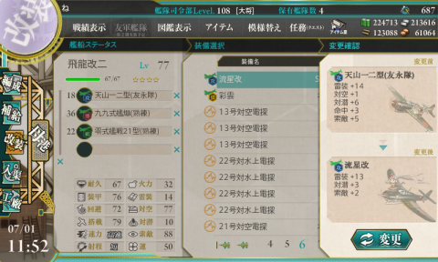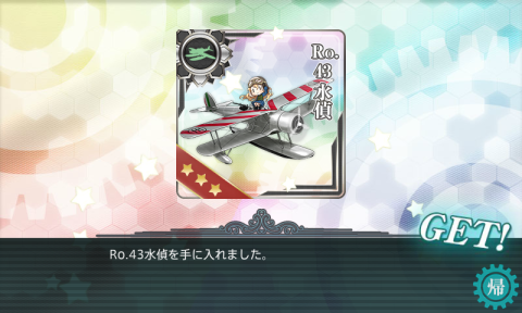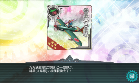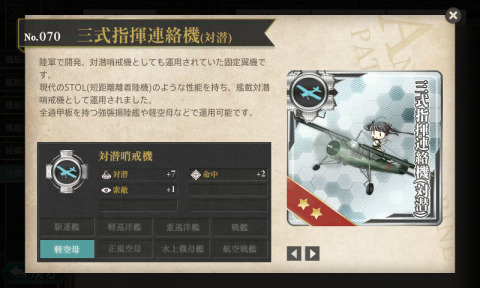改造してもあまり強くならないし、燃費も悪くなるので、さらに使い道がない感じになりますが、初期装備で強い対潜水艦の艦載機を2つ持ってきます。
