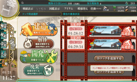 大鳳を建造した動画をみてたら建造したくなったので、動画と同じレシピと旗艦で13度目の大型建造、旗艦RJで燃料4000 弾薬2000 鋼材5000 ボーキサイト7000 開発資材20。