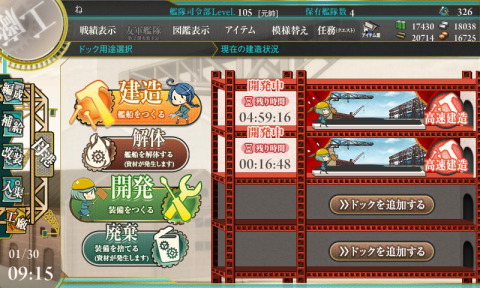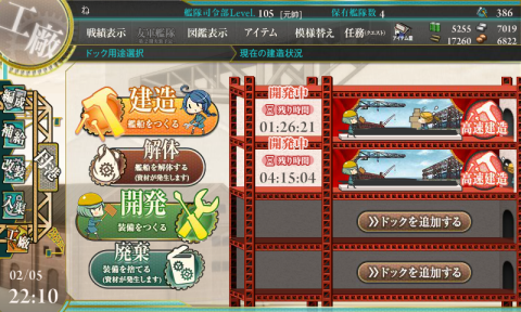 4、5度目の大型建造、大鳳狙いで燃料3500 弾薬3500 鋼材6000 ボーキサイト6000 開発資材100と20。飛龍とあきつ丸がでました。さすがに開発資材100だと資材が枯渇するので20にしました。あきつ丸は狙うのが難しいみたいなので、大発とかを持ってくるし、はずれというほどではないのかな。