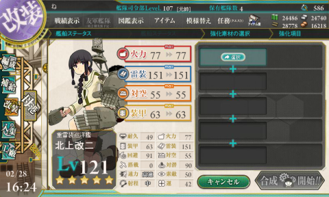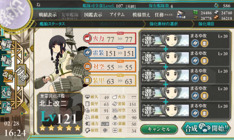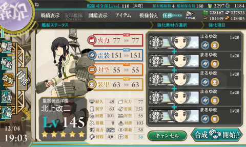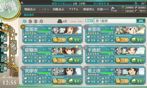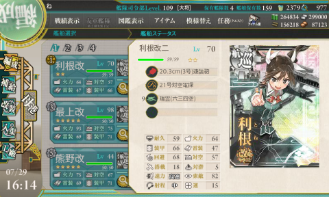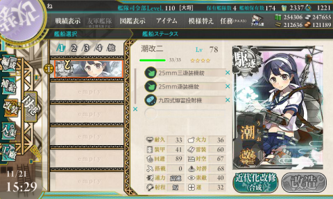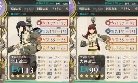 武蔵がレベル上限になった。資源効率が一番良い演習の旗艦、大破撤退しやすい海域などで使ってレベルを上げました。