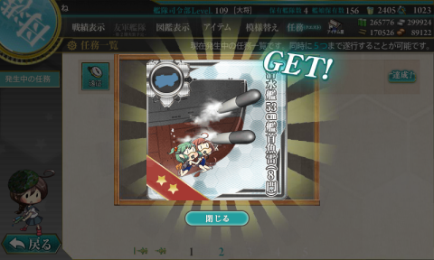 アップデートで那珂改二、駆逐艦の任務4つ、新装備「増設バルジ」がきました。
