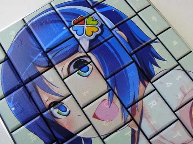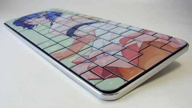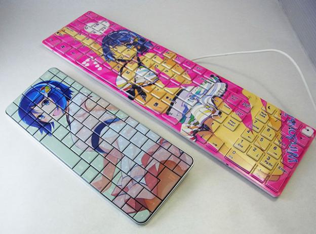 確かに発色に関しては最近出ている痛キーボードに比べると地味。ベースが黒いキーボードなのでどうしてもその地色が出てしまうのとプリント方式の特性だろう。 しかしこのコミケ版WedgeMobileKeyboardはその塗装が本気なのだ。色は確かに控えめだが鮮明さは文句なし。元イラストの線の強弱さえ判るレベルだ。