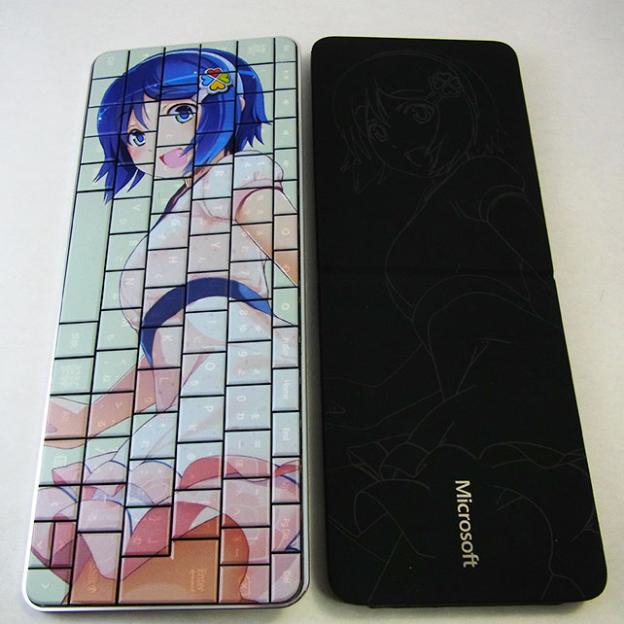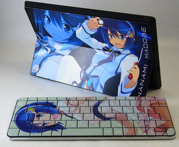 更に前回のゆう・あい浴衣バージョンに無かった特徴として、カバー側にも同じ絵柄の線画が描かれているのだ。触った感じは線が出っ張っている訳でもなく、塗装・プリントというわけではなさそうだ(元々あるMicrosoftロゴは出っ張っている)。こちらも耐久性はありそうにみえるのだが、元々カバー自体がすごく汚れやすい材質なのでむしろ本体より気を使ってしまう。