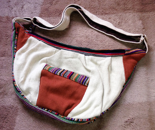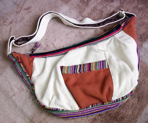 アジアン、ヒッピー、フォークロア系の服や雑貨が人気のエスニック雑貨店チャイハネのオリジナルブランド「Amina」のショルダーバッグで、ネパールの手織り無地にワンポイントで入ったストライプ生地が特徴的なシンプルなモノです。