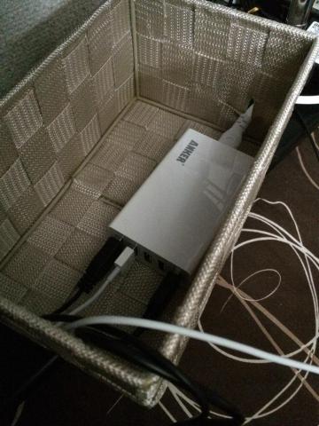 使っていないケーブルは中に放り込んで散らばらないようにできますし、スマホ等の小さい端末も箱に放り込めます。