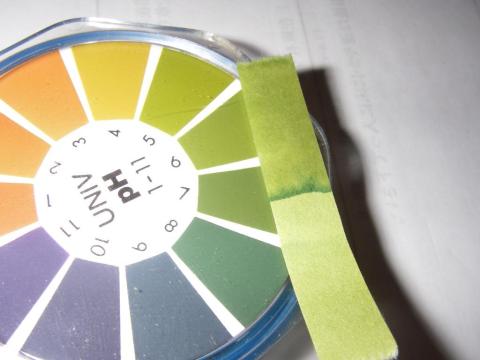 「多分」と書いたのは、万能試験紙は大雑把に液性を把握するには向いているのですが、結構曖昧だからです。pH5.8~6.5くらいですかね…