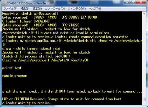 そして、スケッチでコンソール画面に出力するprintfの実行実験です。