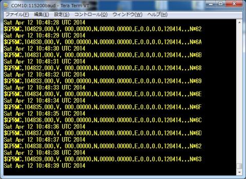 衛星捕捉させていないので2014/04/12 10:48:39とかになっていますが、GPRMCの時刻とRTCの時刻は一致させることができました。