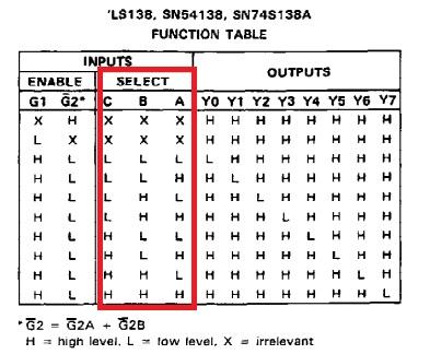 まずAをセットし、C:0 B:1 A:0(2)、次にBをセットしC:0 B:0 A:0 (0)、最後にCをセットしC:1 B:0 A:0(4)の点灯状態へ移行します。