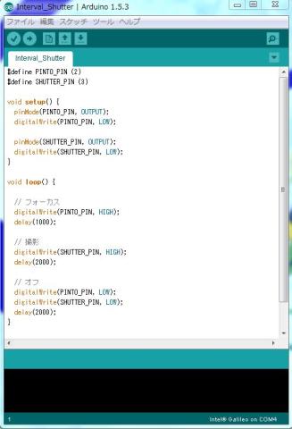 作った回路でインターバル撮影をするためのスケッチを作成します。
