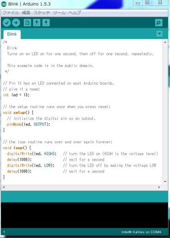 Galileo用Arduino IDEを起動して、ファイルから スケッチの例 01.Basic Blinkを選びGalileoに書き込んで....