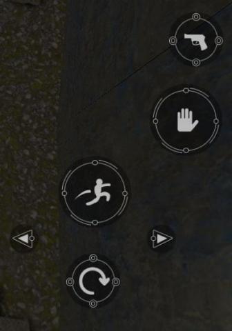 画面右側には上から「銃」は銃を持つモード、「手」は何かにつかまる時や段差を登る時に使用します。銃を持つモードの時は「手」から「照準」に変わり、銃を撃つボタンとなります。