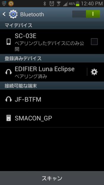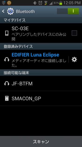 そうすると、接続可能な端末の欄に「EDIFIRE Luna Eclipse」と表示されるので、タップすればペアリング完了だ。