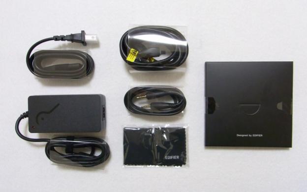 その他の付属品としては、ACアダプター、電源ケーブル、スピーカー接続用ケーブル、3.5mmステレオミニプラグケーブル、クロス、取扱説明書。
