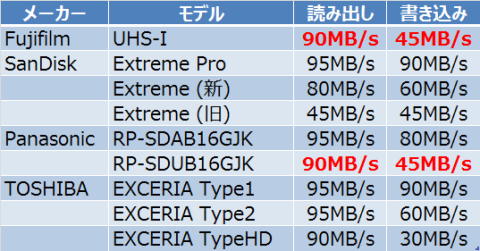 多分どこかのOEMと思われるので、主要メーカーのUHS-I対応SDHC(16GB)のスペックを比較してみた。