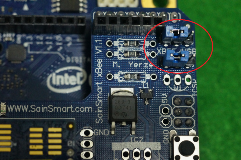 Arduino ではプログラム転送時はUSB側、プログラム実行時はXBee側に切り替えるらしいのですが、Galileoで使う場合はジャンパーはXBee側固定でいいです。