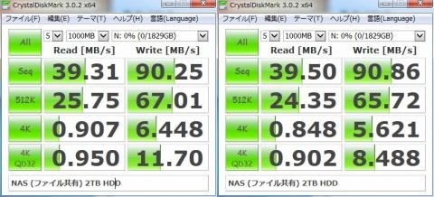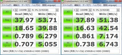 HDDを2台接続して、使用可能なRAID構成のベンチマークテストを実施した結果です。
