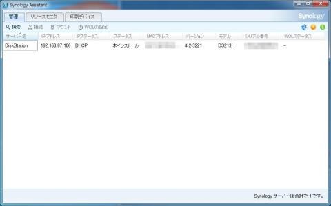 付属のCDROMから「Synology Assistant」をインストールしました。