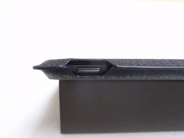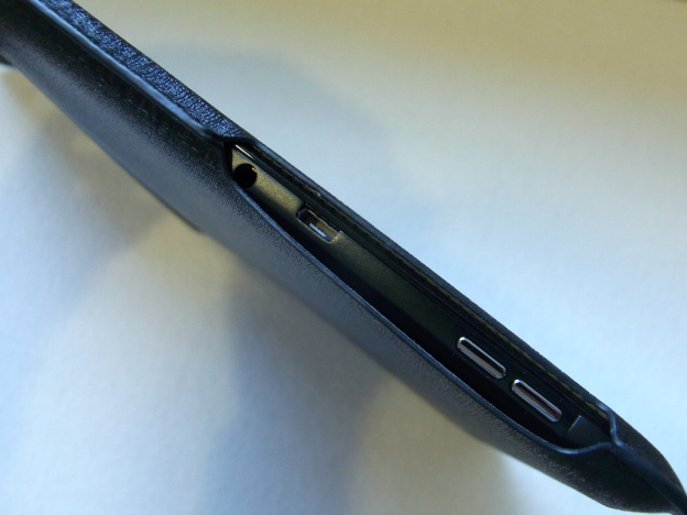 右側面の音量ボタン、Micro USB、3.5mmステレオミニジャック。ステレオミニジャックに干渉しているように見えたので、実際にプラグを差してみたところ、ギリギリ干渉していなかった。