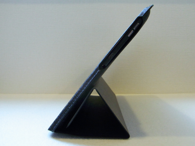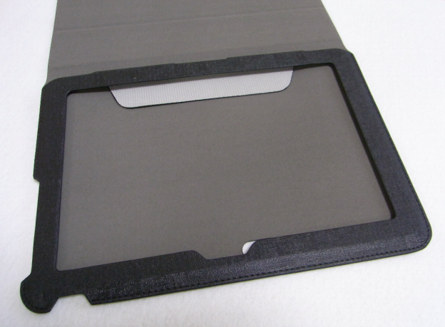 タブレットを横から滑らせながらぐいぐいと押し込む。固定器具としては、折り返し(白色の部分)があるくらいだが、ジャストフィットなので、タブレットが抜け落ちる心配はない。