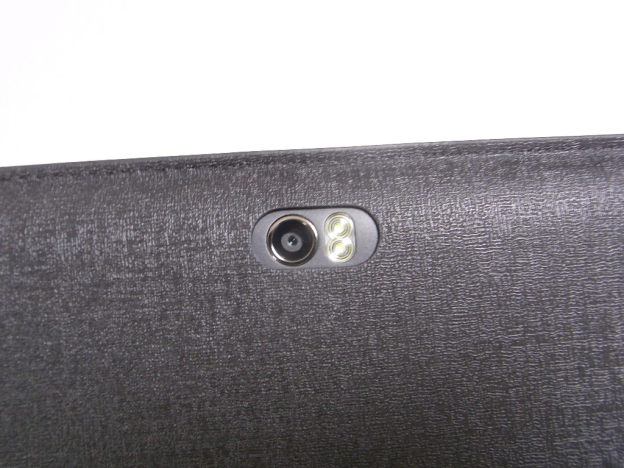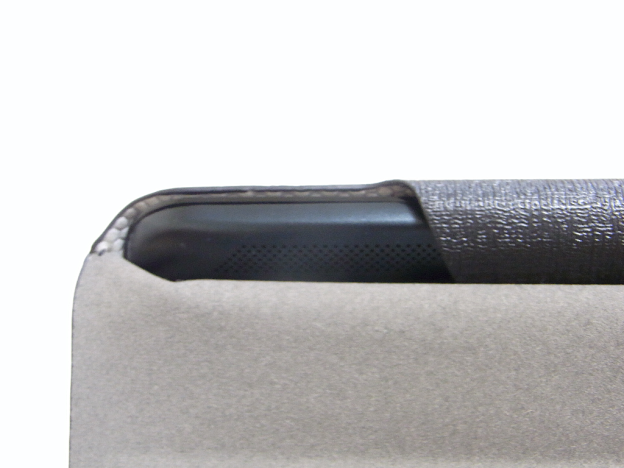 素材はPUレザーで、ざらっとした肌触り。縫製の具合は悪くない。スタンド機能のある折り返し用の溝が2本ある。