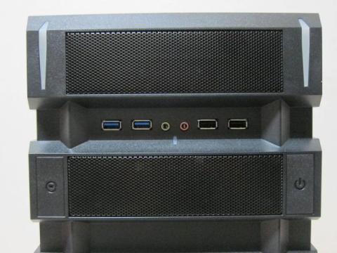 フロントI/Oは,USB3.0×2,USB2.0×2,オーディオIN/OUTとオーソドックスです.また,電源SW,リセットSW,HDDアクセスLED(赤)があります.このリセットSWですが,一見,存在しないように見えます.左側が電源SWなので,その対象位置の左側には,指で押せるようなSWが存在しません.しかし,ペン先で押せるSWがあります.誤って,リセットSWを押してしまう事がないような配慮だと思います.
