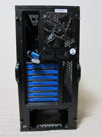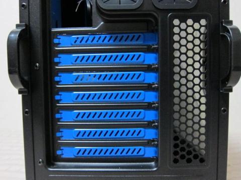 リアも拡張スロットのブルーがまぶしいです.配置はオーソドックスで,本格水冷用の配管穴も用意されています.リアフォンの位置から,簡易水冷への対応状況が想像できますが,詳細は後述します.