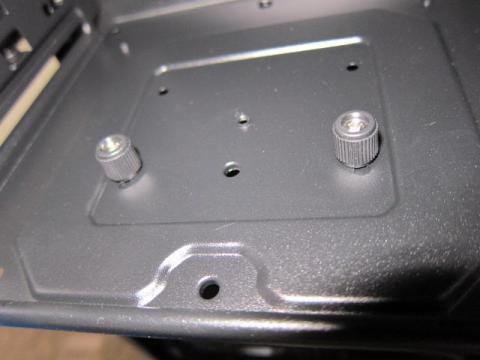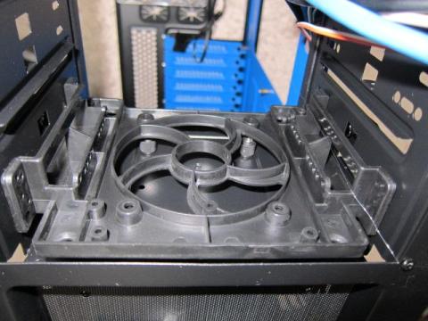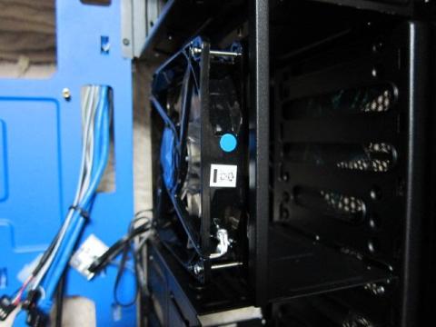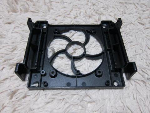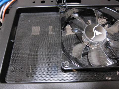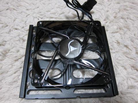 このベイ変更を可能にしているケージのパーツですが,よく見ると,120mmファンが取り付けられます.ただし,ケージの内側からネジ止めすることになりますので,ちょっと大変なのと,1段目と4段目のドライブが使用できなくなります.また,固定には,ファン付属ネジやM4ネジは使えず,M3ネジのみです.