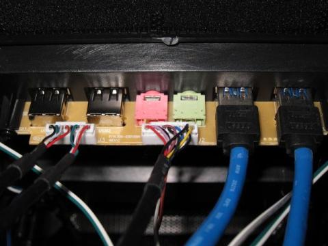 フロントI/Oのケーブルも,十分な長さがあります.このケーブルの中に,4ピンペリフェラル(大)の12V電源がありますが,イルミネーションLED用ですので,気にせず接続してしまいましょう! そのためか,Power LEDの接続はありません.ただ注意点として,これらのケーブルをきちんと止めてしまうと,フロントパネルが外せなくなります.フロントI/Oケーブルは,余裕を持たせたマネジメントが必要です.
