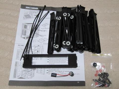 簡単なマニアル(多言語),ドライブケージ用のスライドレール,3.5インチオープンベイ用の5.25インチベゼル,スピーカー,ネジ類です.