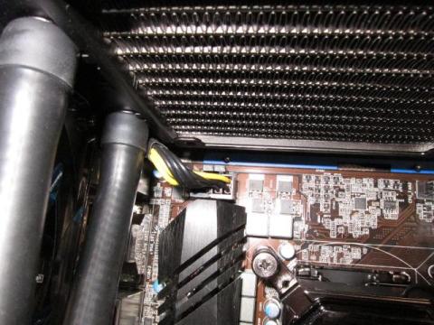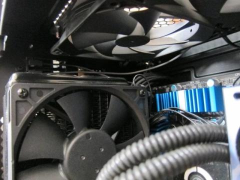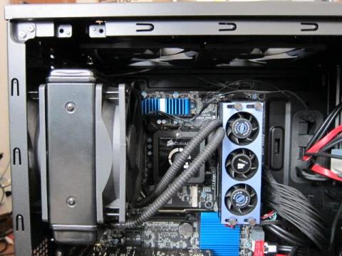 ちなみに,KUHLER H2O 920とCorsair 400Rとの組み合わせは,こんな感じです.トップに140mmファンを2つ設置したままでも,取り付け可能です.