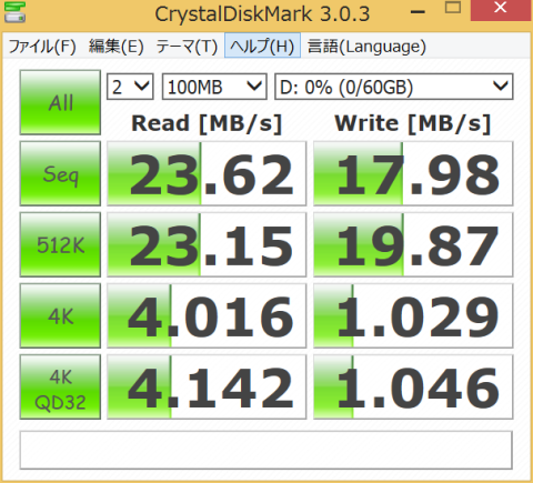 SDストレージコントローラーの性能によるものなのか、速度は伸びません。とはいえ、データ読み出しを中心に考えるのであれば問題は無い性能でしょう。標準クラスのUSBメモリーよりは全体的に良好な結果です。
