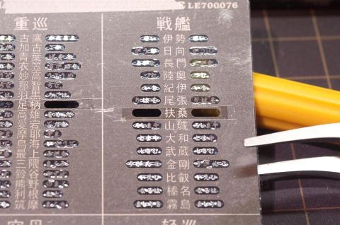 まずは、貼り付けたい艦名の裏側にあるブルーのビニールを切り取って剥がします。