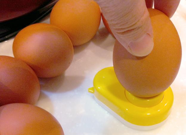 冷蔵庫から出したての玉子の底に小さい穴をあけて、沸騰したお湯に放り込み8分ゆでる(最初の2分はかき混ぜる)っていう簡単レシピなのですが、それを何度か試すうちに、穴あけ器がほしくなり購入しました。