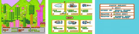 ゲームは全8ステージから構成されており、各ステージ(最終ステージを除く)では点在する敵の前線基地をすべて破壊してボス戦へと挑みます。画面は横スクロール形式で、左右どちらの方向にも自由に進むことができます。また、本作最大の特徴はパワーアップの方法です。敵を倒したら現れるコインを貯めて、ゲーム中に登場するショップで強化アイテムを購入すれば、オパオパをパワーアップできます。