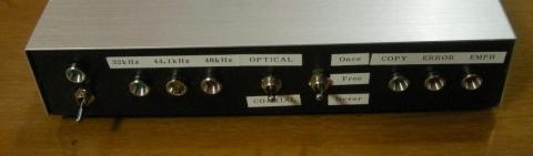 左側から電源LED/SW、サンプリング周波数表示器、入力セレクタ、謎のSW、エラー表示器