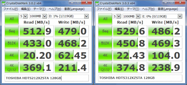 見た目ははっきりいって地味で、高級感も無い。しかしその性能は紛れもなく東芝SSD。早速ベンチマーク…前回のHG5dのスコアもあわせて。