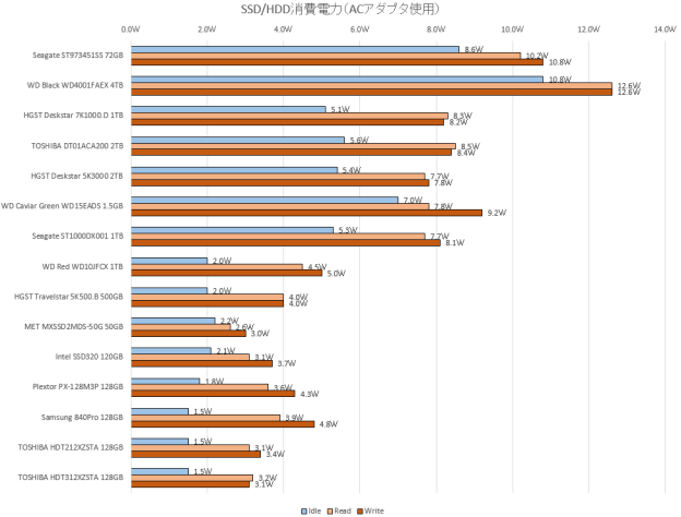 ※ACアダプタで1W程度消費しているのでSSD単体はこれよりさらに低い