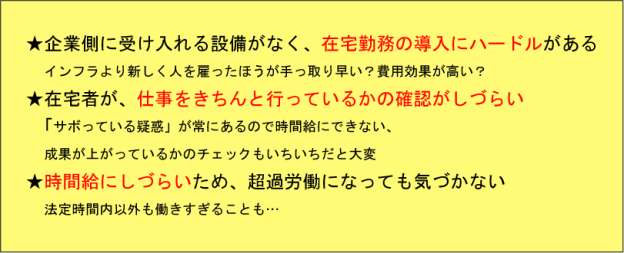前回あげた問題点を、もう一度掲示しておきます。ポイントとしては、インフラ/在席確認/労働基準の3点です。